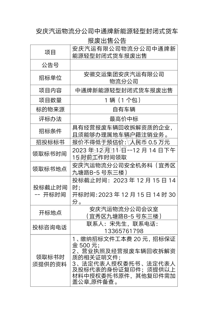安慶汽運物流分公司中通牌新能源輕型封閉式貨車 報廢出售公告